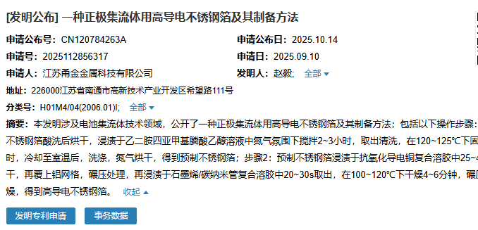 2025年10月14日,江蘇甬金金屬科技有限公司成功申請一項名為“一種正極集流體用高導電不銹鋼箔及其制備方法”專利,申請公布號為CN120784263A,申請日期為2025年9月10日。